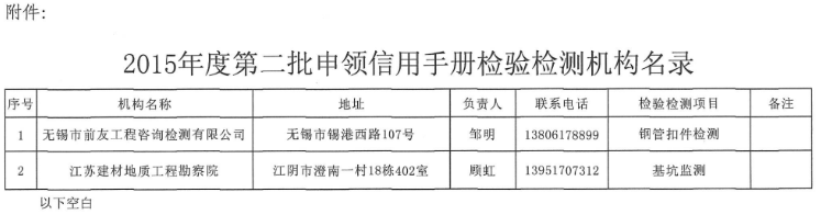 據悉,無錫市建設工程安全監督站發出錫建安監【2015】24號文“關于公布2015年度無錫市第二批申領建設工程安全類檢驗檢測機構信用手冊名錄的通知”。 為加強我市建設工程安全類檢驗檢測的管理,根據《無錫市建設工程安全類檢驗檢測機構信用管理辦法》,經各檢測機構自主申報,市安監站組織對2015年度申報的第二批建設工程安全類檢驗檢測機構進行了資料核查,將經核查符合條件的建設工程安全類檢驗檢測機構名錄予以公布。