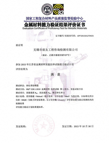 為加強全省檢測機構的監督管理,全面提高檢測機構金屬材料室溫拉伸檢測的整體水平,根據省質量技術監督局蘇質監認函[2015]12號文的要求,國家工程復合材料產品質量監督檢驗中心作為技術支持單位,于2015年5月~10月在全省范圍內實施了金屬材料室溫拉伸試驗能力驗證活動。 元月22日,在南京召開了江蘇省金屬材料室溫拉伸能力驗證結果通報會暨檢測技術交流會,會議內容有:實驗室資質認定要求及評審準則解讀;2015年全省金屬材料室溫拉伸試驗能力驗證結果通報;金屬材料室溫拉伸試驗關鍵因素解析與試驗控制;實驗室認可與能力驗證;發放能力驗證結果報告和證書。 公司派代表參加了會議,領取了金屬材料能力驗證結果評價證書,評價結果為滿意。