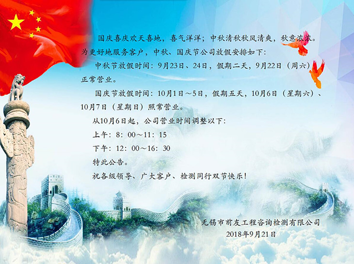 關于中秋、國慶節放假及節后營業時間調整的公告