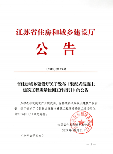 為積極推進建筑產業現代化,保障裝配式混凝土建筑工程質量,江蘇省住建廳制定了《裝配式混凝土建筑工程質量檢測工作指引》,已于2019年10月21日以【2019】第23號公告發布,自2019年11月1日起施行。 該工作指引共分二部分。第一部分為裝配式混凝土建筑工程質量檢測管理,分別對建設單位、設計單位、施工單位、預制構件生產單位、檢測機構明確了應遵守的法律法規規章規定、應執行的標準規范和技術文件。第二部分為裝配式混凝土建筑工程質量檢測技術,包含:預制構配件進場檢驗、預制構配件安裝與連接檢驗、裝配式混凝土結構實體質量檢測等。