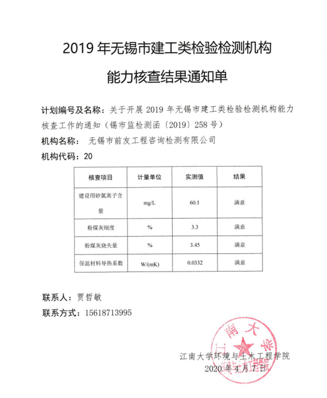 為加強全市建工類檢測機構的監(jiān)督管理,2019年四季度,無錫市市場監(jiān)督管理局組織開展了全市建工類檢驗檢測機構能力核查,委托江南大學具體實施。核查項目包括:建設用砂氯離子含量、粉煤灰細度、粉煤灰燒失量、保溫材料導熱系數(shù)。 近日,公司收到能力核查結果通知單。無錫市前友工程咨詢檢測有限公司核查項目結果全部滿意。