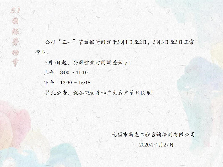 | 關(guān)于“五一”勞動節(jié)放假及節(jié)后營業(yè)時間調(diào)整的公告 | ||