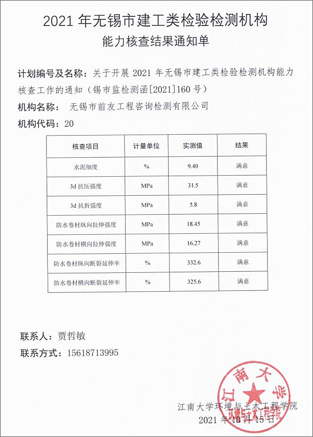 | 2021年無錫市建工類檢驗檢測項目能力核查公司獲滿意 | ||