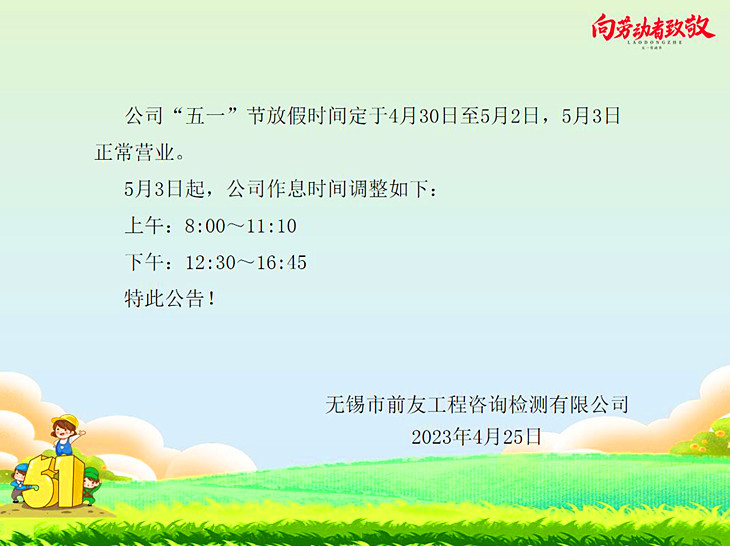 | 關(guān)于“五一”勞動(dòng)節(jié)放假及節(jié)后營業(yè)時(shí)間調(diào)整的公告 | ||