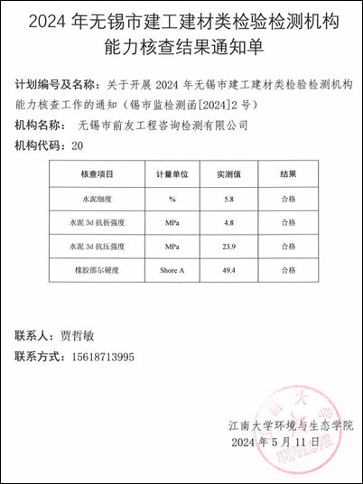 為加強對我市資質認定檢驗檢測機構的事中事后監管,提升檢驗檢測機構技術能力水平,根據《檢驗檢測機構監督管理辦法》第十八條并結合我市實際,無錫市市場監督管理局于4月份在全市檢驗檢測機構中開展水泥細度、3d抗折強度、3d抗壓強度、橡膠邵爾硬度4個參數的檢驗檢測能力核查工作。 本次能力核查工作委托江南大學為技術支持單位,負責能力核查作業指導書制定、樣品準備、結果匯總、統計分析等工作。 水泥細度、3d抗折強度、3d抗壓強度參數測定結果采用Z比分數進行判定。|Z|≤2,判定為合格(滿意值),說明機構目前的檢測能力狀況良好;2<|Z|<3,判定為不合格(可疑值),說明機構目前的檢測能力狀況存在一定問題;|Z|≥3,判定為不合格(不滿意值或離群值),說明機構目前的檢驗檢測能力狀況不理想,存在較大問題。橡膠邵爾硬度按照與標準物質證書指定值進行比對,在證書規定的允許誤差范圍內為合格(滿意結果),不在證書規定的允許誤差范圍內為不合格(不滿意結果)。本次能力核查中,無錫市前友工程咨詢檢測有限公司均獲得滿意結果。