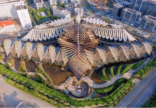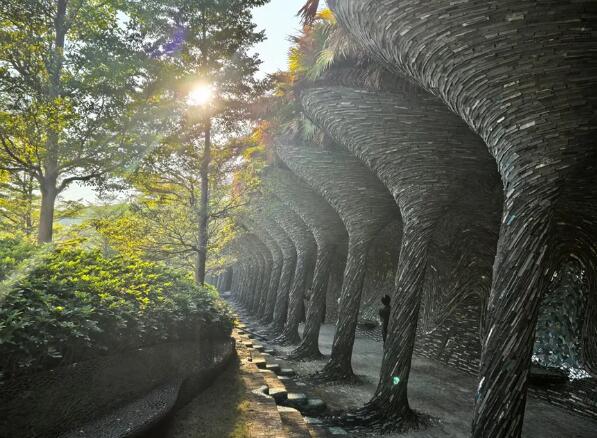 建造過程是工匠精神的全面體現,建設方對工期無要求,工程于2007年設計,2009年初開工,2021年底竣工,整體施工過程歷時13年。工程運用自然界的各種生物形態,如植物根莖、葉片和動物羽毛等元素豐富設計創作,樹冠般的屋檐、藤蔓般的石壁、叢林般的空間結構使得建筑具有嚴謹邏輯次序的同時,又富質感與動態感,流動與呼吸的感覺在石墻石柱間彌散,回收的天然石材、磚塊和廢棄的碎瓷片重塑后獲得了新的生命力量。大量的弧線、拱形、雙曲面等結構元素,隨處可見的回收舊材再創作,彰顯其對手工藝復興及環境可持續發展的理念。該工程先后克服諸多力學、仿生學、綠色技術、施工工藝難點等,單個工程就創出9項國家發明專利和35項實用新型專利。