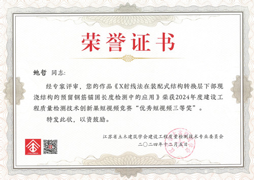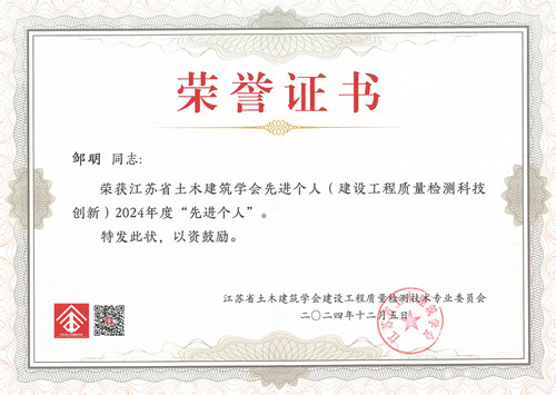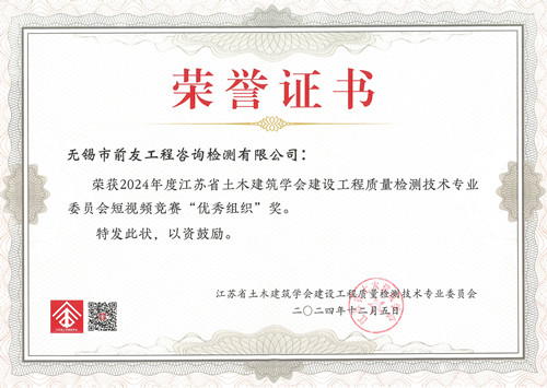 12月5日,第六屆全省建設工程質(zhì)量檢測技術(shù)研討會暨江蘇省土木建筑學會建設工程質(zhì)量檢測技術(shù)專業(yè)委員會2024年年會在南京召開。省、市建設行業(yè)行政主管部門領(lǐng)導、省土木建筑學會領(lǐng)導、專委會委員及會員代表近200人參加會議。 會議主題:守正創(chuàng)新,智慧未來。主要內(nèi)容:江蘇省土木建筑學會建設工程質(zhì)量檢測技術(shù)專業(yè)委員會2024年度工作總結(jié);江蘇省土木建筑學會先進集體(建設工程質(zhì)量檢測科技創(chuàng)新)、先進個人(建設工程質(zhì)量檢測科技創(chuàng)新)表彰;優(yōu)秀論文表彰;創(chuàng)新成果短視頻表彰;專家學術(shù)報告及檢測機構(gòu)經(jīng)驗交流等。 無錫市前友工程咨詢檢測有限公司獲江蘇省土木建筑學會(建設工程質(zhì)量檢測科技創(chuàng)新)先進集體和短視頻競賽“優(yōu)秀組織獎”。鄒明研究員級高工獲(建設工程質(zhì)量檢測科技創(chuàng)新)先進個人,鮑哲高工獲2024年度建設工程質(zhì)量檢測技術(shù)創(chuàng)新成果短視頻競賽“優(yōu)秀短視頻三等獎”。